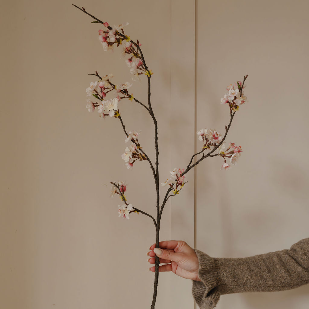 Designed with realistic detailing and natural-looking branches, this faux cherry blossom stem adds height, texture, and softness to any arrangement. The subtle colour variation creates depth and movement, making it perfect for styling in tall vases, spring centrepieces, wedding displays, or layered floral arrangements.