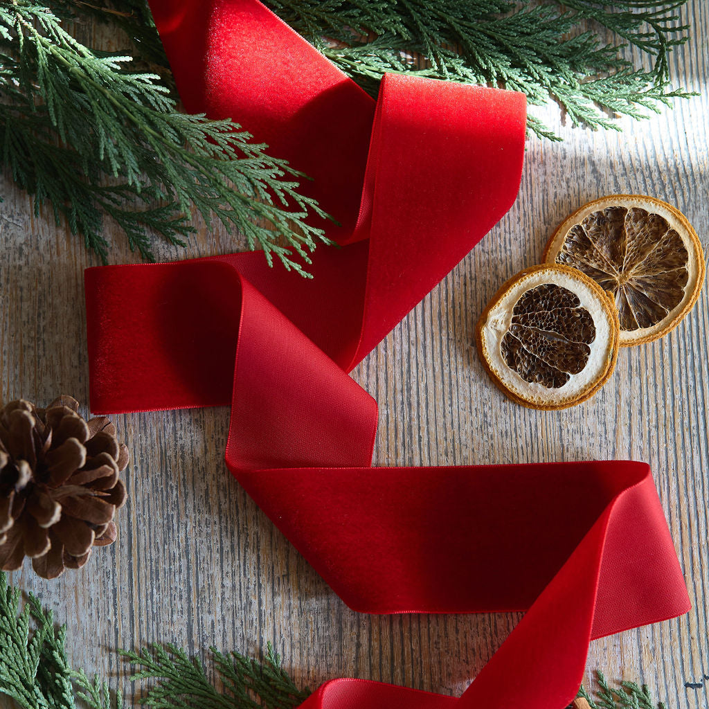 Splendid scarlet velvet ribbon ideal for enhancing your festive décor--wreaths, garlands, mantels, and more!